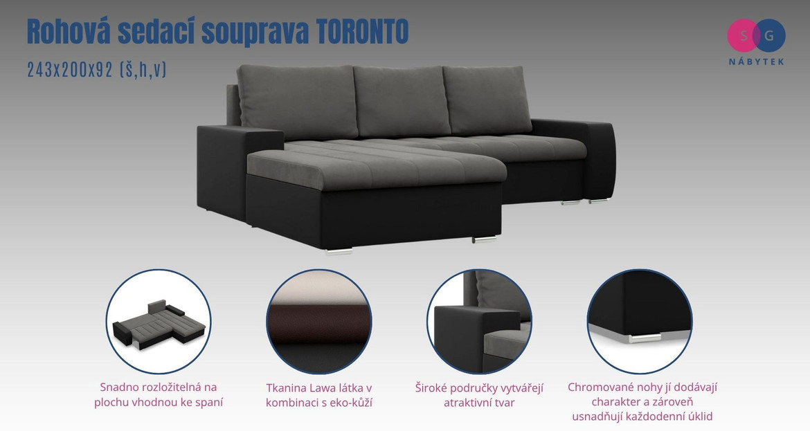 Pevná konstrukce ze dřeva a OSB desky. Potah z kvalitní látky v mnoha moderních barevných odstínech. Snadné rozkládání na lůžkovou podobu. Moderní design vhodný do všech současných interiérů.