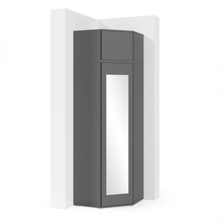 Moderní rohová skříň s nástavbou AMI II se skládá z úložných prostorů a 2 šatních tyčí. Díky jejímu tvaru se výborně hodí na zaplnění prázdného rohu v místnosti. Je vyrobena z kvalitního lamina.
