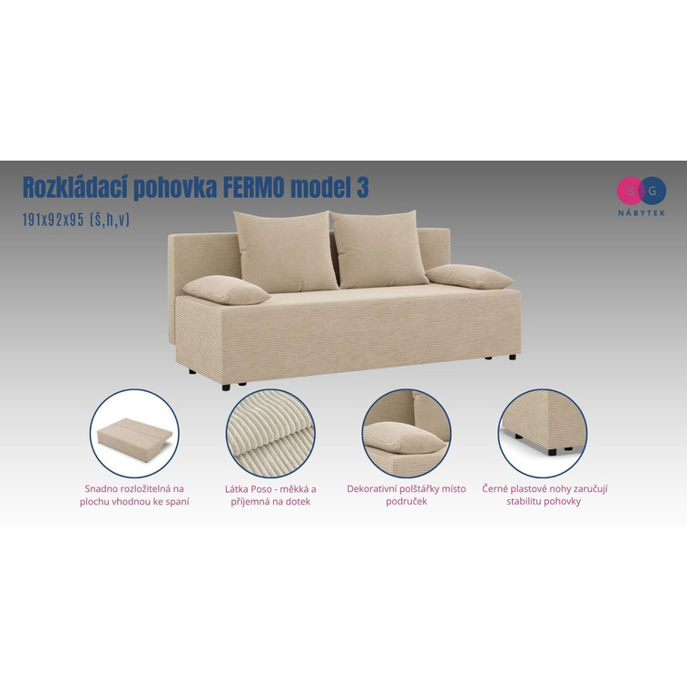 Pevná konstrukce ze dřeva a OSB desky. Potah z kvalitní látky v mnoha moderních barevných odstínech. Snadné rozkládání pohovky na lůžkovou podobu. Moderní design vhodný do všech současných interiérů.
