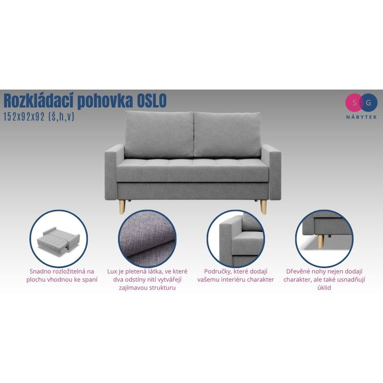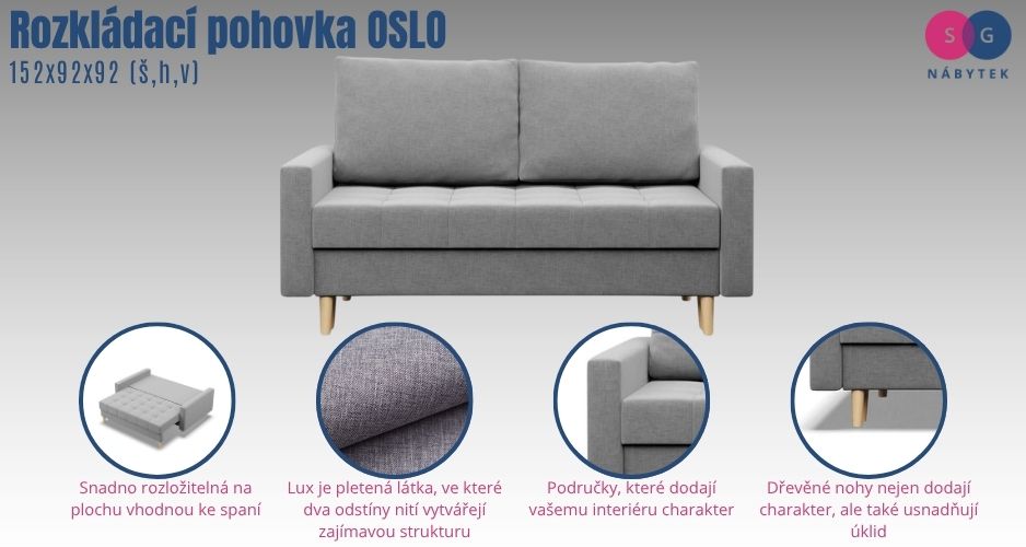 Pevná konstrukce ze dřeva a OSB desky. Snadné rozkládání pohovky na lůžkovou podobu. Moderní skandinávský design vhodný do všech současných interiérů.