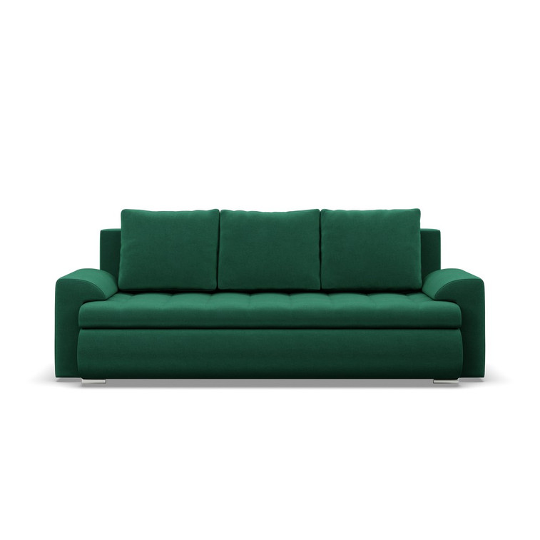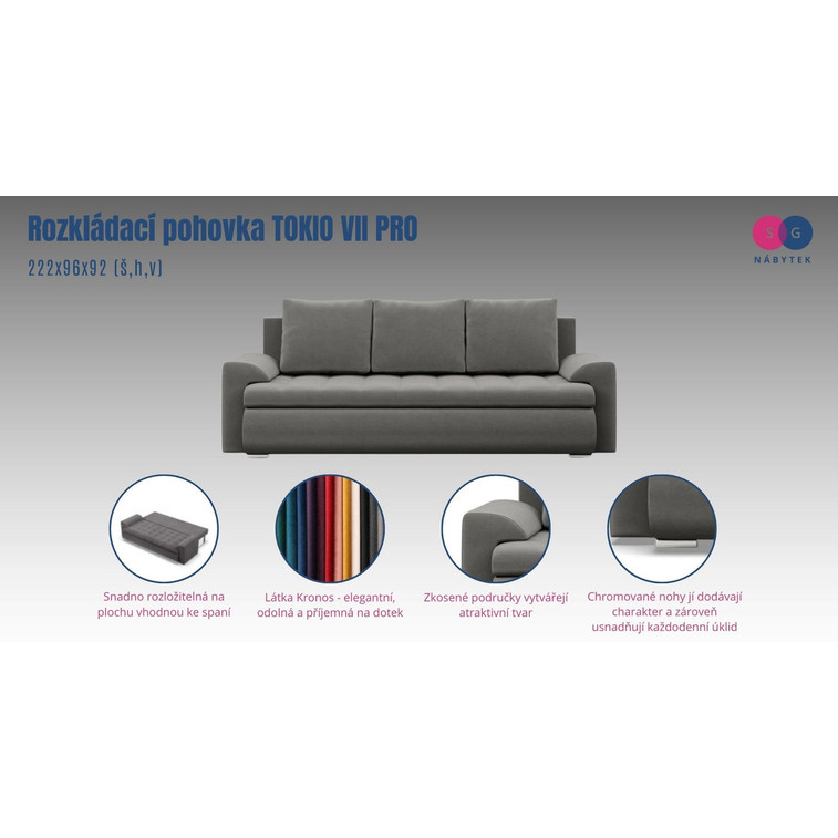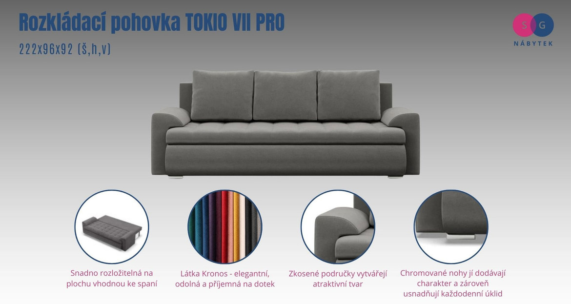Pevná konstrukce ze dřeva a OSB desky. Potah z kvalitní tkaniny v mnoha moderních barevných odstínech. Sedací část je prošívaná. Snadné rozkládání pohovky na lůžkovou podobu. Moderní design vhodný do všech současných interiérů.