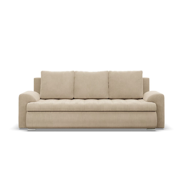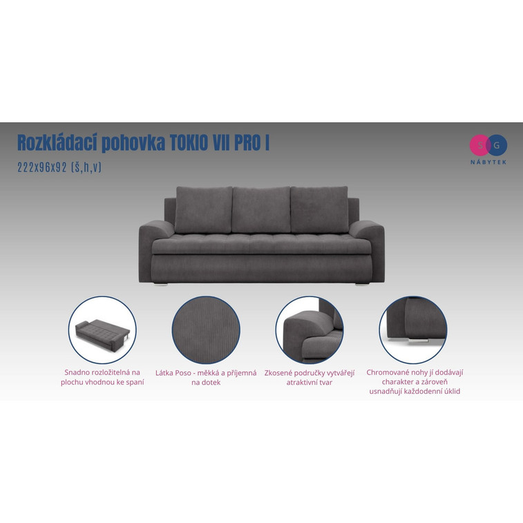 Pevná konstrukce ze dřeva a OSB desky. Potah z kvalitní tkaniny v mnoha moderních barevných odstínech. Sedací část je prošívaná. Snadné rozkládání pohovky na lůžkovou podobu. Moderní design vhodný do všech současných interiérů.