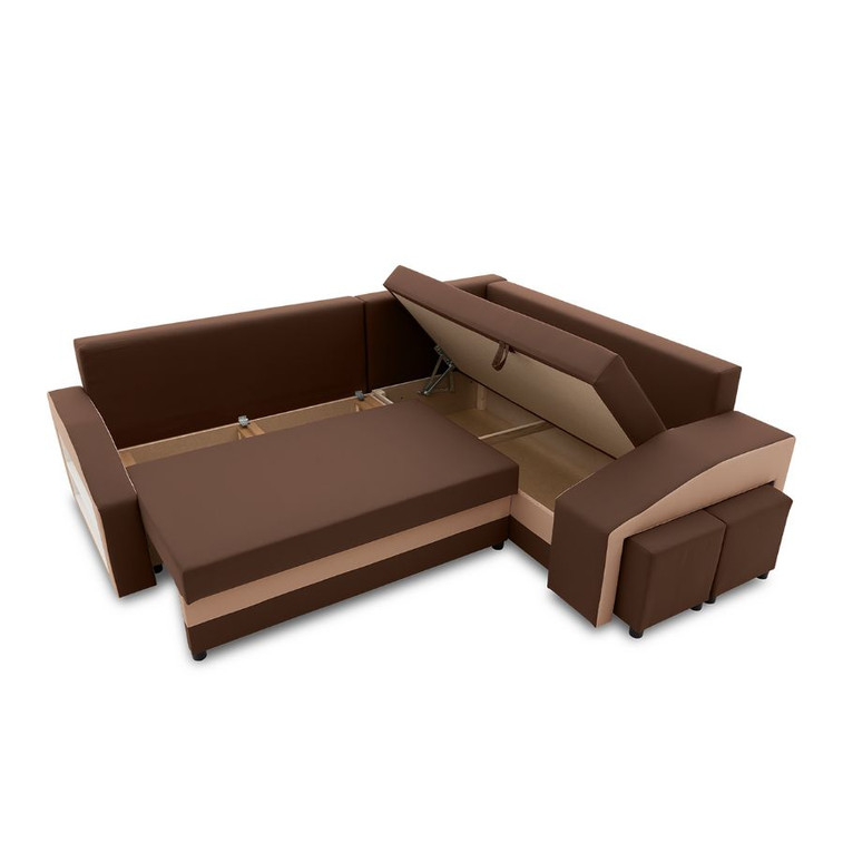 Pevná konstrukce ze dřeva a OSB desky. Potah z kvalitní látky v mnoha moderních barevných odstínech. Snadné rozkládání pohovky na lůžkovou podobu. Praktické taburety + poličky v boku sedačky. Moderní design vhodný do všech současných interiérů