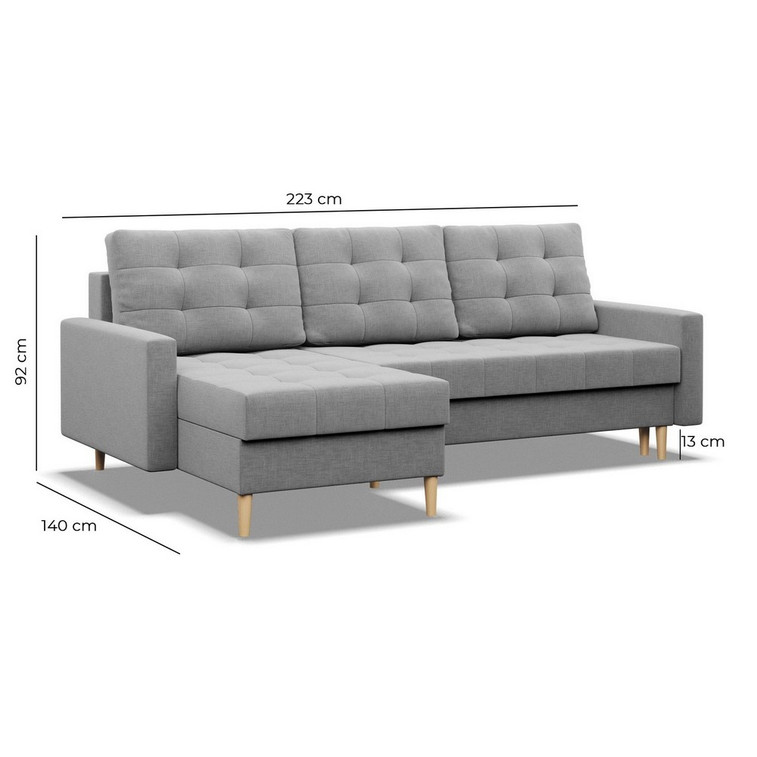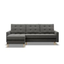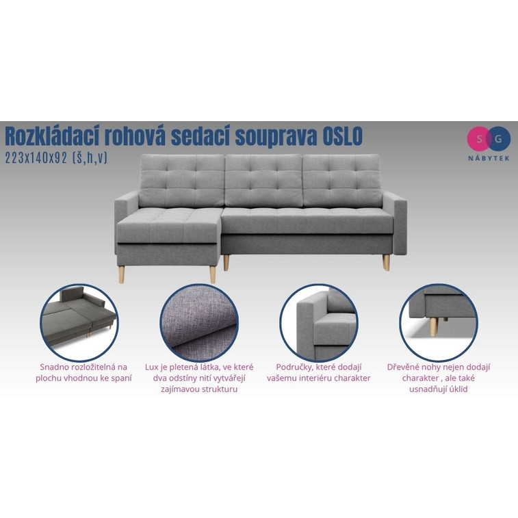 Pevná konstrukce ze dřeva a OSB desky. Potah z kvalitní látky Lux v moderních barevných odstínech. Při montáži monžnost zvolení levé nebo pravé strany. Snadné rozkládání pohovky na lůžkovou podobu. Moderní skandinávský design vhodný do všech současných interiérů.