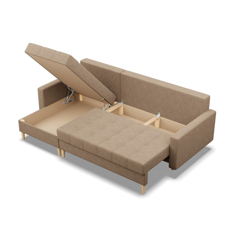 Pevná konstrukce ze dřeva a OSB desky. Potah z kvalitní látky Lux v moderních barevných odstínech. Při montáži monžnost zvolení levé nebo pravé strany. Snadné rozkládání pohovky na lůžkovou podobu. Moderní skandinávský design vhodný do všech současných interiérů.