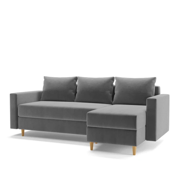 Rohová rozkládací pohovka Rio je dostupná v zajímavých barvách a dřevěné nohy odkazují na skandinávský styl.
