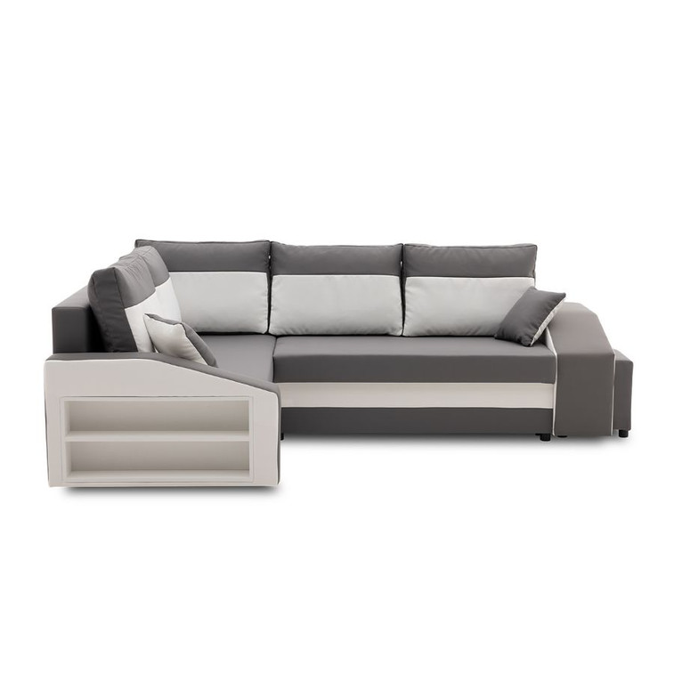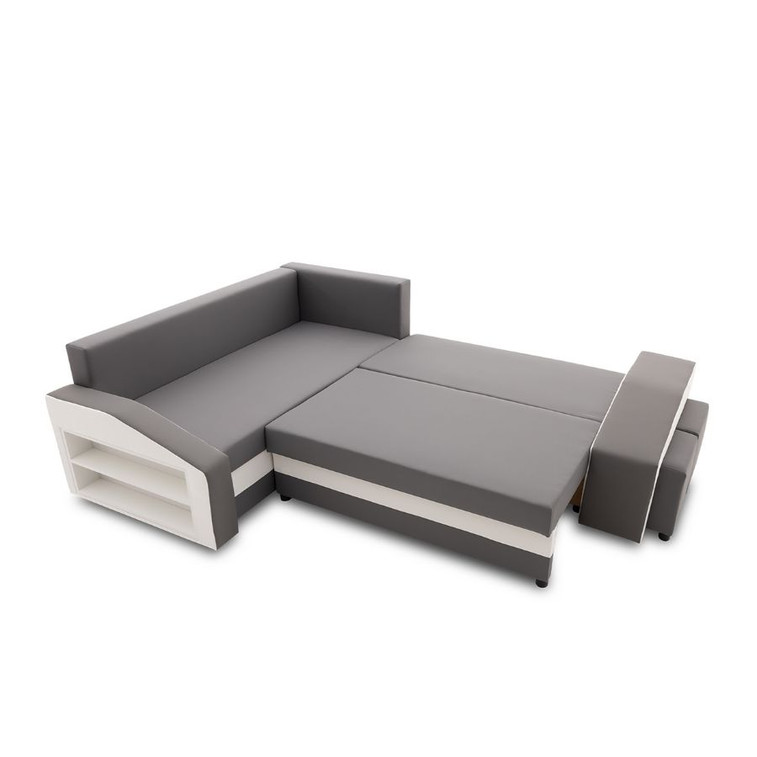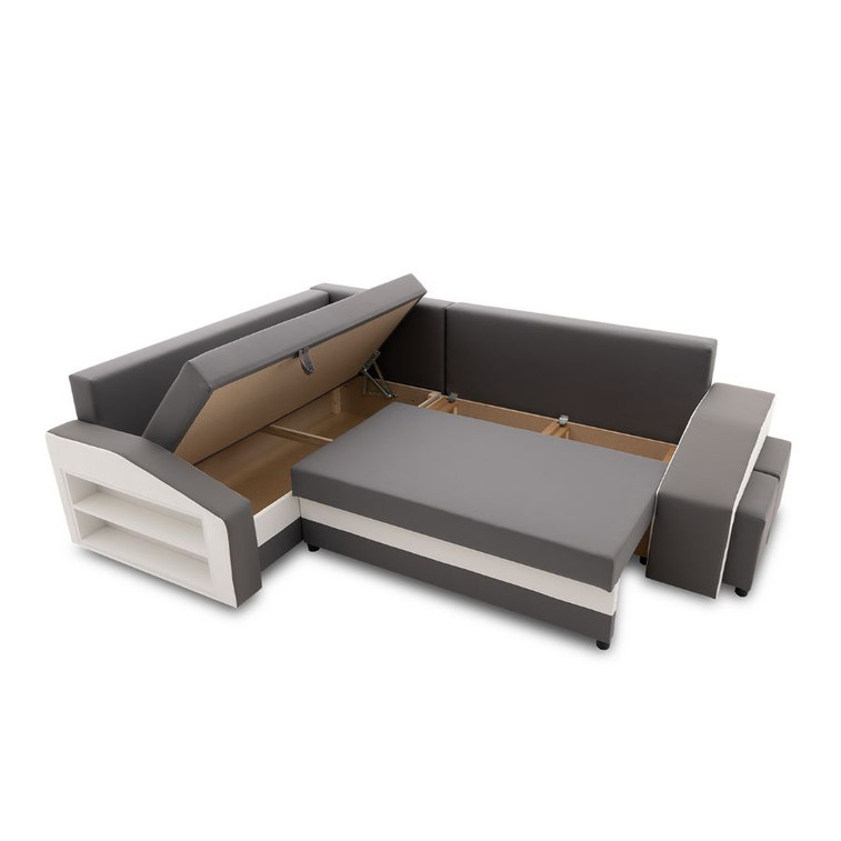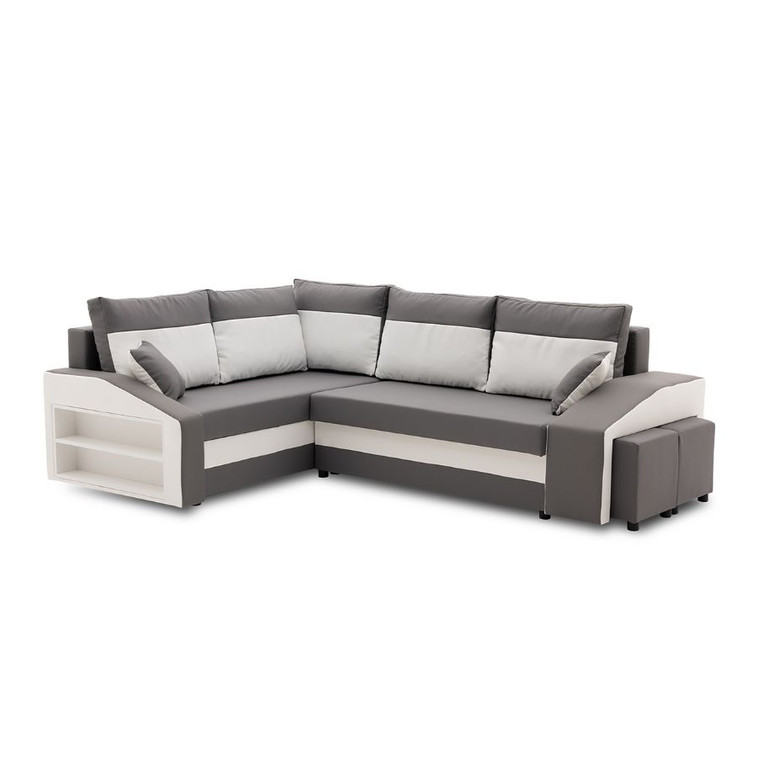 Rozkládací rohová sedací souprava s taburety a poličkou GRANDE micro Levá Šedá/bílá