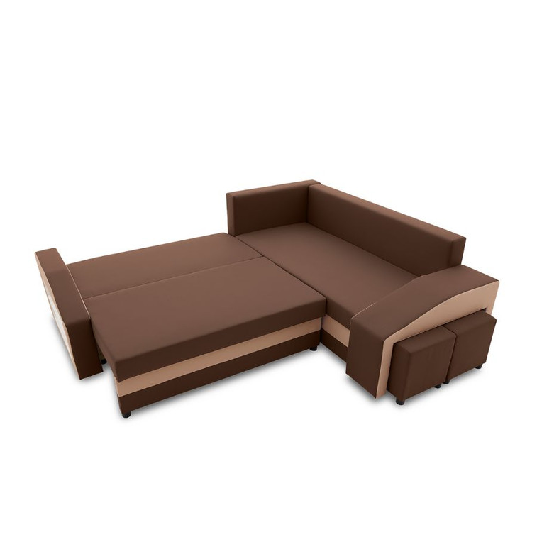 Pevná konstrukce ze dřeva a OSB desky. Potah z kvalitní látky v mnoha moderních barevných odstínech. Snadné rozkládání pohovky na lůžkovou podobu. Praktické taburety + poličky v boku sedačky. Moderní design vhodný do všech současných interiérů.
