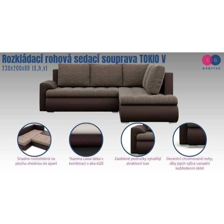 Pevná konstrukce ze dřeva a OSB desky. Potah z kvalitní tkaniny v mnoha moderních barevných odstínech. Sedací část je prošívaná. Snadné rozkládání sedací soupravy na lůžkovou podobu. Moderní design vhodný do všech současných interiérů.