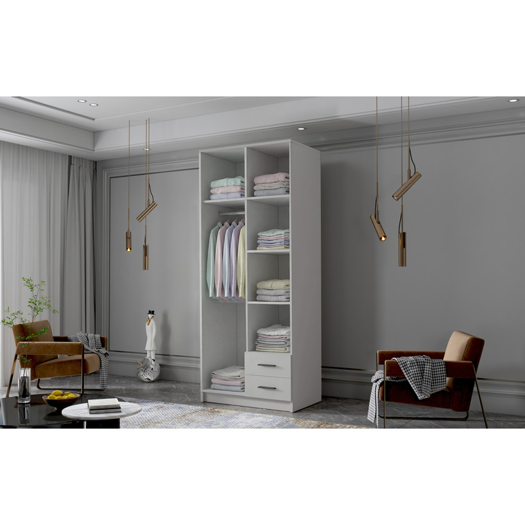Šatní skříň kombinuje klasickou jednoduchost a moderní design. Je ideální jako šatní skříň do předsíně nebo místo pro uložení oblečení v ložnici nebo jiných drobností každodenní potřeby. Šatní skříně je rozdělena na dvě části. Na jedné straně jsou police a dvě zásuvky, a na druhé straně je závěsná šatní tyč a police.