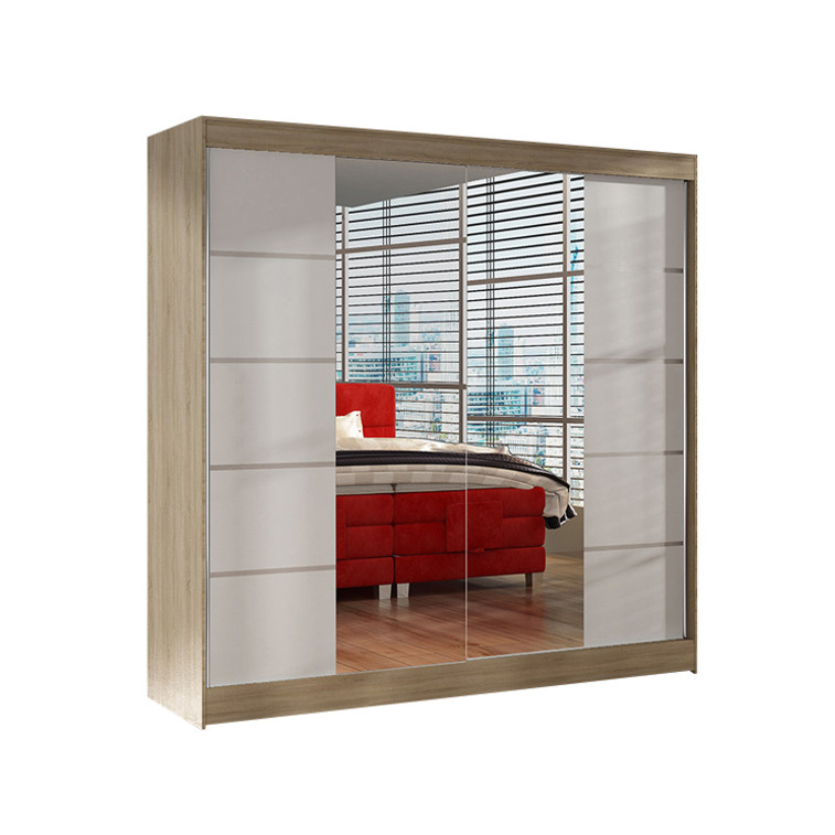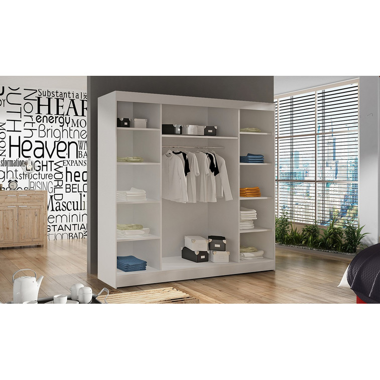 Prostorná šatní skříň Basti V je vyrobena v moderním designu a nabízí velké množství praktického úložného prostoru.
