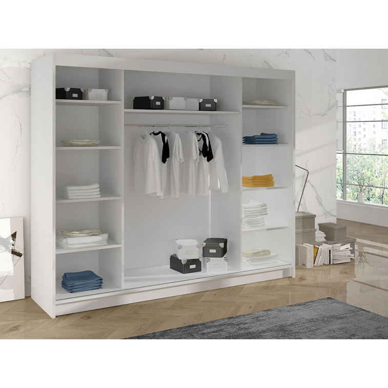 Šatní skříň Derby II je vyrobena v moderním designu a nabízí velké množství praktického úložného prostoru. Neocenitelný je systém trendových posuvných dveří, které usnadňují manipulaci a šetří prostor v interiéru.
