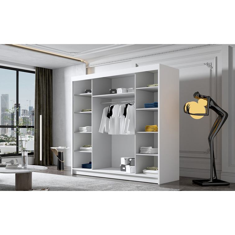 Posuvná šatní skříň EVO VI kombinuje klasickou jednoduchost a moderní design. Zrcadlo umístěné na dveřích dodává své jedinečné kouzlo. Je ideální jako šatní skříň do předsíně nebo místo pro uložení oblečení v ložnici nebo jiných drobností každodenní potřeby.