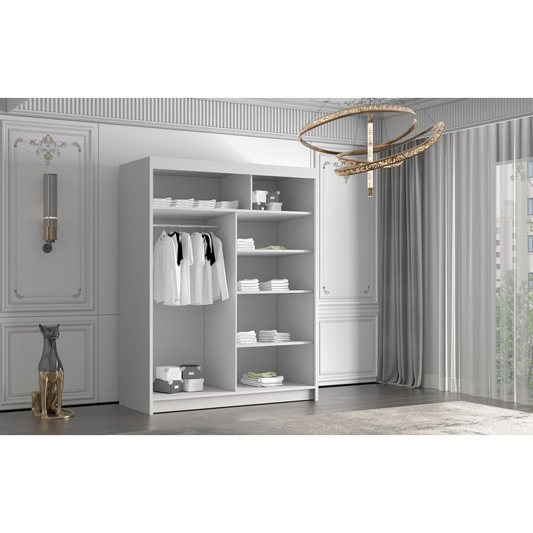 Posuvná šatní skříň Flavio IV kombinuje klasickou jednoduchost a moderní design. Je ideální jako šatní skříň do předsíně nebo místo pro uložení oblečení v ložnici nebo jiných drobností každodenní potřeby. Šatní skříň je rozdělena na dvě stejné části. Na jedné straně jsou police a na druhé straně je závěsná šatní tyč.