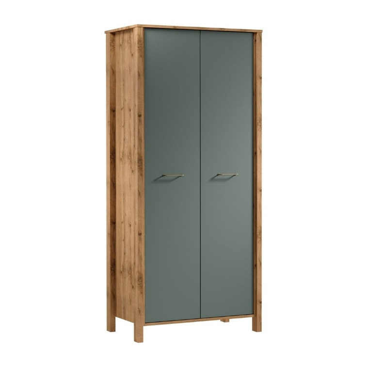 Šatní skříň s tyčí na zavěšení oblečení a s 2 praktickými policemi. Matně zlaté rukojeti dodávají eleganci. Přírodní barvy teplého dekoru dub Wotan na korpusu nábytku v kombinaci s jednobarevnou béžovou nebo zelenou na výběr dělají kolekci přirozeně krásnou.