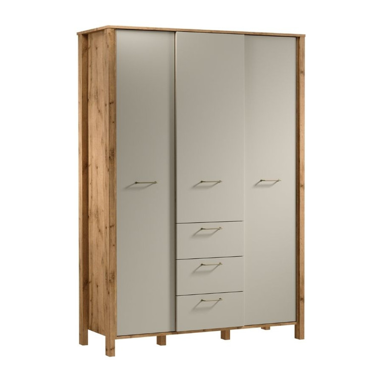 Šatní skříň S3D3S se skvěle hodí k uložení oblečení. Zásuvky mají funkci plného výsuvu, což výrazně usnadňuje přístup k předmětům uvnitř. V bočních částech šatní skříně jsou tyče na zavěšení oblečení a uprostřed jsou police. Matně zlaté rukojeti dodávají eleganci. Přírodní barvy teplého dekoru dub Wotan na korpusu nábytku v kombinaci s jednobarevnou béžovou nebo zelenou na výběr dělají kolekci přirozeně krásnou.