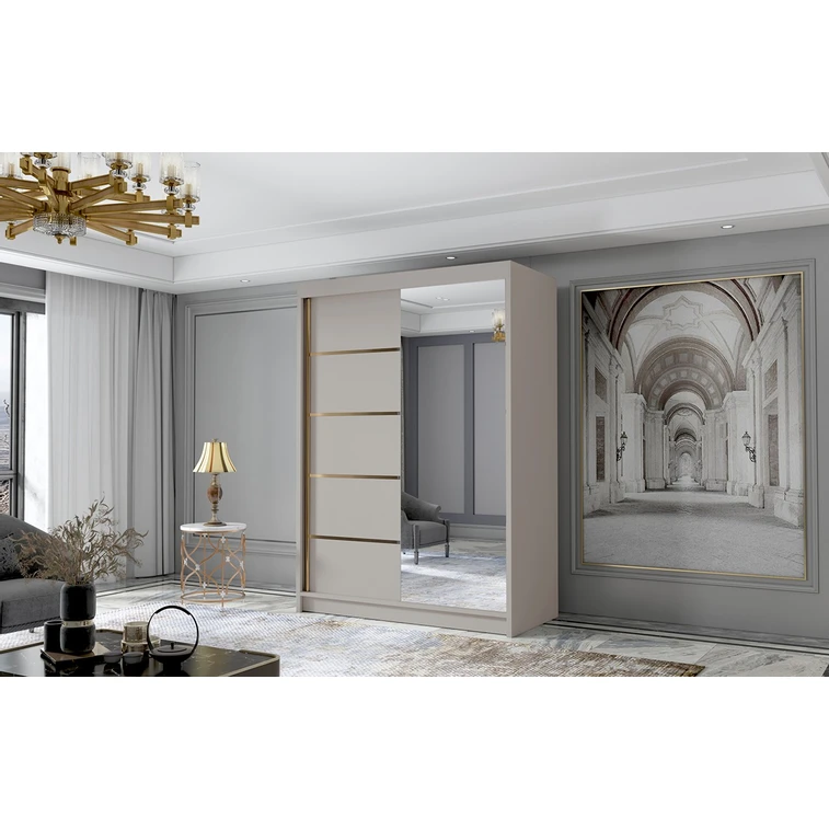 Posuvná šatní skříň Lungo III kombinuje klasickou jednoduchost a moderní design. Zrcadlo umístěné na dveřích dodává své jedinečné kouzlo. Je ideální jako šatní skříň do předsíně nebo místo pro uložení oblečení v ložnici nebo jiných drobností každodenní potřeby. Šatní skříň je rozdělena na dvě stejné části. Na jedné straně jsou police a na druhé straně je závěsná šatní tyč.