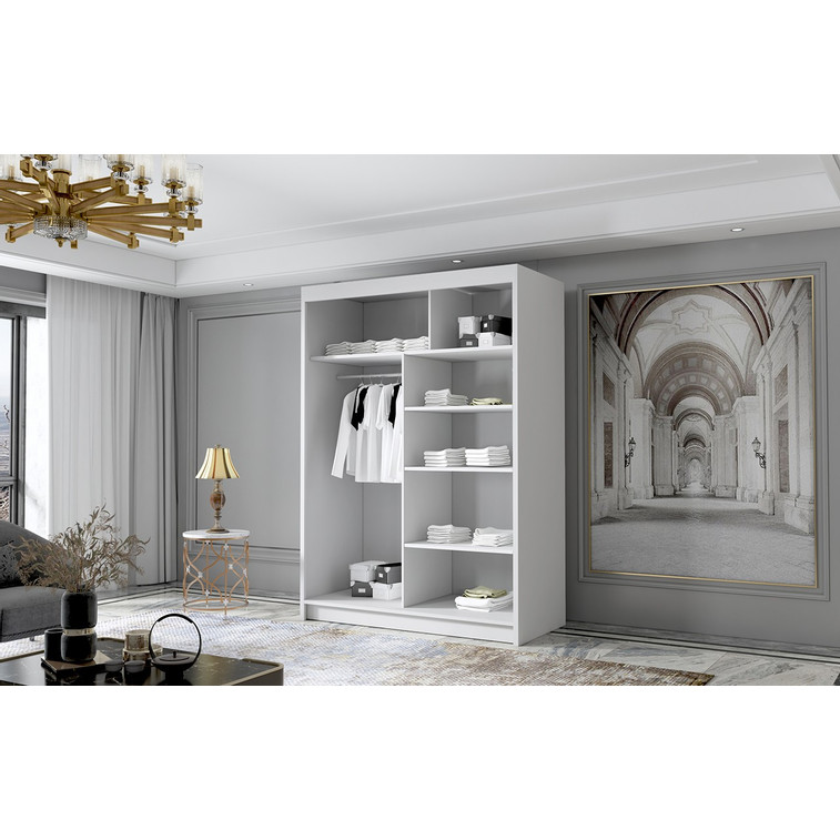 Posuvná šatní skříň Lungo III kombinuje klasickou jednoduchost a moderní design. Zrcadlo umístěné na dveřích dodává své jedinečné kouzlo. Je ideální jako šatní skříň do předsíně nebo místo pro uložení oblečení v ložnici nebo jiných drobností každodenní potřeby. Šatní skříň je rozdělena na dvě stejné části. Na jedné straně jsou police a na druhé straně je závěsná šatní tyč.
