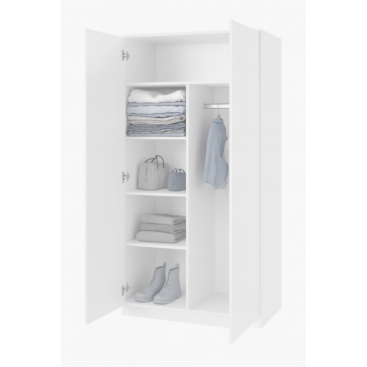 Šatní skříň je jedinečný kus nábytku, který se bude hodit do ložnice jako šatní skříň, tak do obývacího pokoje nebo dětského pokoje, kam chcete uložit oblečení a další potřebné věci. Součástí skříně je kovová tyč na ramínka a 4 police.