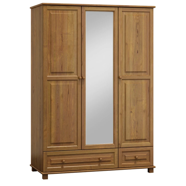 Velká rodinná skříň SZ65b je vyrobená z masivu borovice, který je ošetřený transparentním lakem. Tím je nábytek chráněný před drobnými povrchovými poškozeními. Skříň má police, které jsou skryty za dvířky, ve zbývající dvoudvéřové části je ukryta tyč k pověšení ramínek. Ve spodní části se nacházejí 2 šuplíky. Vkusný vzhled je doplněn kulatými úchyty, a nožkami. Dvířka jsou upravena jemným frézováním.