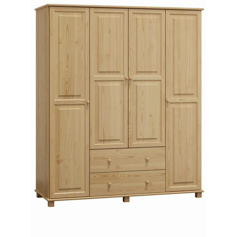 Velká šatní skříň SZ76 je vyrobená z masivu borovice, který je ošetřený transparentním lakem. Tím je nábytek chráněný před drobnými povrchovými poškozeními. Skříň má po stranách police, které jsou skryty za dvířky, v prostřední dvoudvéřové části je šatní tyč k pověšení ramínek. Ve spodní části se nacházejí 2 šuplíky. Vkusný vzhled je doplněn kulatými úchyty, a nožkami. Dvířka jsou upravena jemným frézováním.