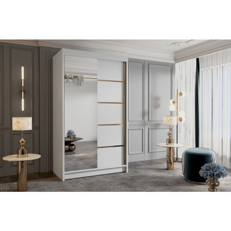Posuvná šatní skříň Vigo III kombinuje klasickou jednoduchost a moderní design. Zrcadlo umístěné na dveřích dodává své jedinečné kouzlo. Je ideální jako šatní skříň do předsíně nebo místo pro uložení oblečení v ložnici nebo jiných drobností každodenní potřeby. Šatní skříň je rozdělena na dvě stejné části. Na jedné straně jsou police a na druhé straně je závěsná šatní tyč.