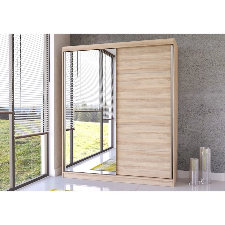 Šatní skříň Bella je moderní, takže si ji snadno sladíte se svým interiérem. Šatní skříň má systém posuvných dveří, který usnadňuje používání.