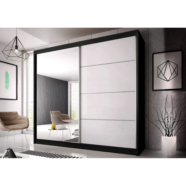 Skříň MULTI 35. Jednoduchá, prostorná a elegantní šatní skříň s ozdobnými pololesklými lištami na přední straně a velkým zrcadlem, které opticky zvětší prostor. Uvnitř  šatní skříně  jsou hluboké police a tyč na ramínka, umožňující snadné třídění oblečení.