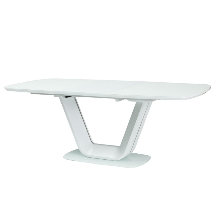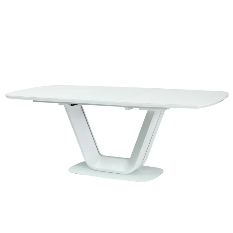 Velmi moderní rozkládací jídelní stůl. Podstavec stolu je vyroben z kartáčované ocele. Plocha stolu je z tvrzeného skla s kombinací MDF. Stůl je určen až pro 8 osob.