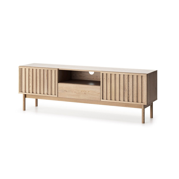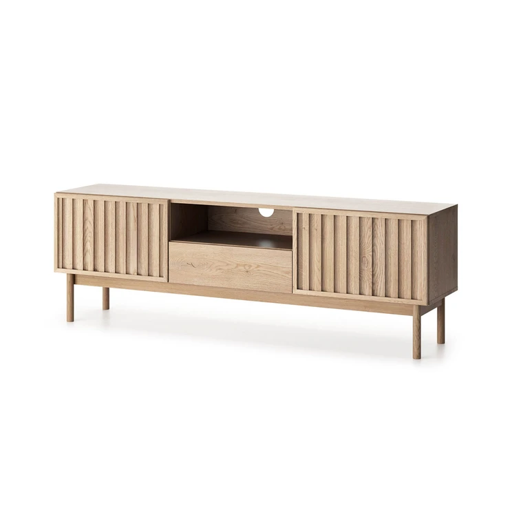 Praktický RTV stolek má dvě prostorné skříňky a jednu zásuvku. Vysoké dřevěné nohy s přídavnou podpěrou, které umožňují snadný přístup pro vysavač.