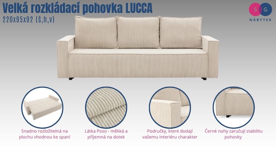 Velká rozkládací pohovka LUCCA model 2  je navržena v minimalistickém stylu. Poslouží jako prostorné místo pro pohodlný odpočinek. Snadno ji rozložíte a užijete si velkou plochu vhodnou na spaní.