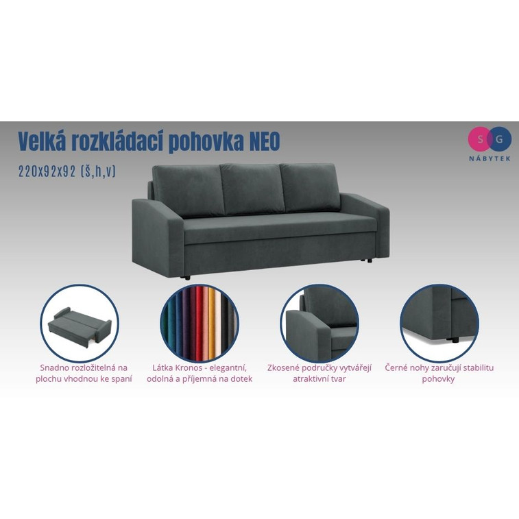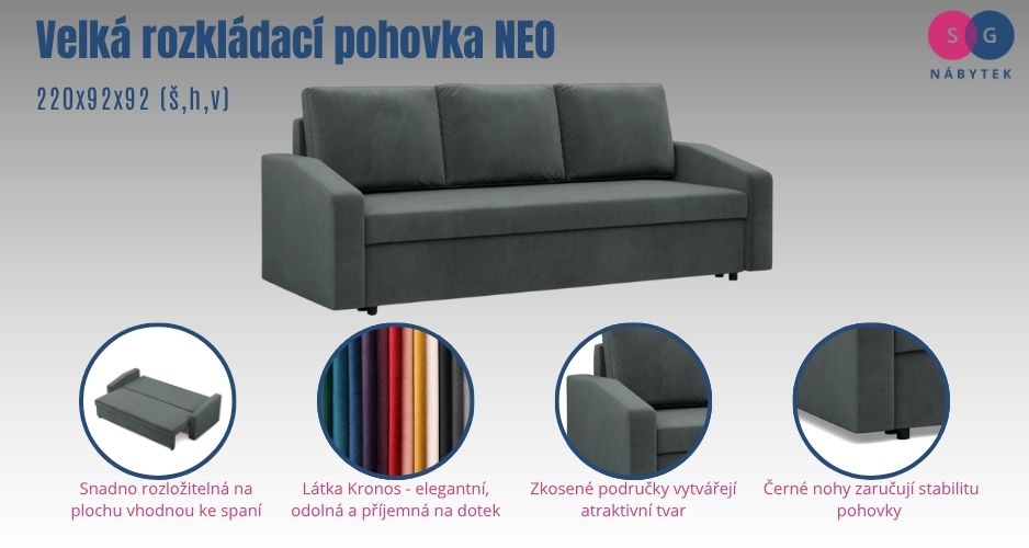 Pohovka NEO je moderní a stylový kus nábytku, který byl navržen s ohledem na lidi kteří oceňují pohodlí a funkčnost. Je vyrobena z pevných, vysoce kvalitních materiálů. Nohy jsou vyrobeny z plastu.