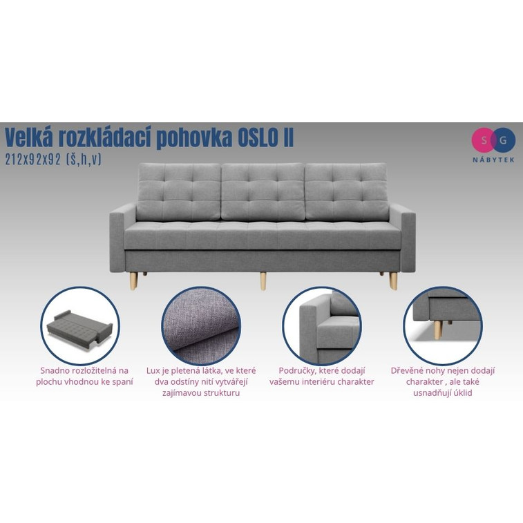 Pevná konstrukce ze dřeva a OSB desky. Snadné rozkládání pohovky na lůžkovou podobu. Moderní skandinávský design vhodný do všech současných interiérů.