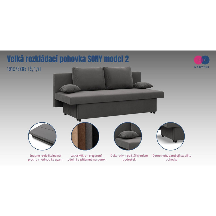 Pevná konstrukce ze dřeva a OSB desky. Potah z kvalitní látky Haiti v mnoha moderních barevných odstínech. Snadné rozkládání pohovky na lůžkovou podobu. Moderní design vhodný do všech současných interiérů.