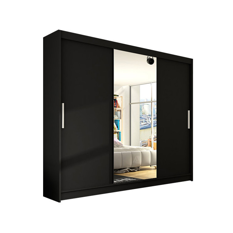 Velká a prostorná šatní skříň Aston I se systémem posuvných dveří. Vyrobena z nejkvalitnějších materiálů. Vodicí systém značně usnadňuje proces otevírání a zavírání šatní skříně. Interiér nábytku je navržen tak, aby v něm bylo místo nejen pro oblečení, ale i jiné drobné osobní předměty. Ideální do ložnice, obývacího pokoje nebo větší haly. Další předností šatní skříně je nádherné velké zrcadlo uprostřed.