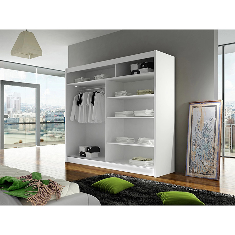 Dvoudveřová šatní skříň se systémem posuvných dveří, který usnadňuje každodenní používání. Moderní, funkční a elegantní. Určeno pro bezpečné uložení oděvů a jiných osobních věcí. Ideální do ložnice, obývacího pokoje nebo haly. Díky klasickému designu bude šatní skříň dokonalým doplňkem tradičních i moderních interiérů domů. Systém posuvných dveří zajistí komfort a pohodlí každodenního používání. Pevně ​​namontovaná vodící lišty umožňují snadné a hladké otevírání skříně.