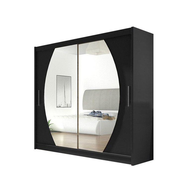Dvoudveřová šatní skříň se systémem posuvných dveří pro každodenní použití. Moderní, funkční a elegantní. Ideální do ložnice, obývacího pokoje nebo haly. Vyznačuje se velkými zajímavými zrcadly na čelech, která opticky zvětší a prosvětlí každou místnost. Vyrobena z kvalitních materiálů.