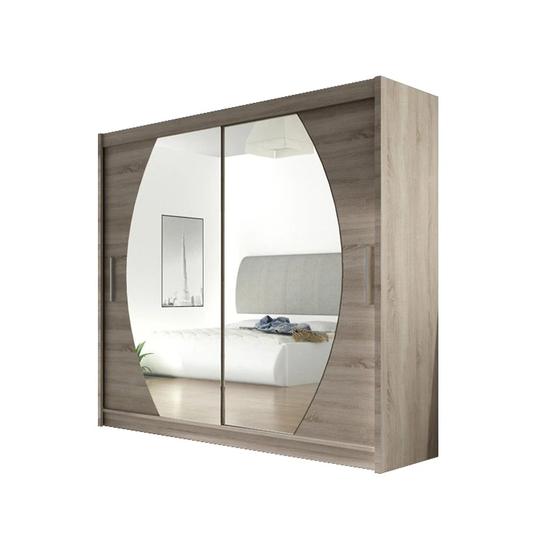 Dvoudveřová šatní skříň se systémem posuvných dveří, která usnadňuje každodenní používání. Moderní, funkční a elegantní. Určeno pro bezpečné uložení oděvů a jiných osobních věcí. Vyznačuje se velkými zajímavými zrcadly na dveřích, která opticky zvětší a prosvětlí každou místnost.