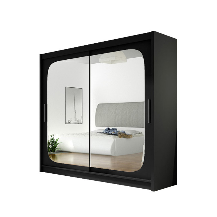 Dvoudveřová šatní skříň Bega VIII se systémem posuvných dveří. Vyrobena z nejkvalitnějších materiálů. Vodicí systém v něm použitý značně usnadňuje proces otevírání a zavírání šatní skříně. Interiér nábytku je navržen tak, aby v něm bylo místo nejen pro oblečení, ale i jiné drobné osobní předměty. Ideální do ložnice, obývacího pokoje nebo haly. Další předností šatní skříně jsou krásné dlouhé stříbrné úchyty, které šatní skříni dodávají další kouzlo a nádherné velké zrcadlo pokrývající téměř celou plochu skříně se zaoblenými rohy.
