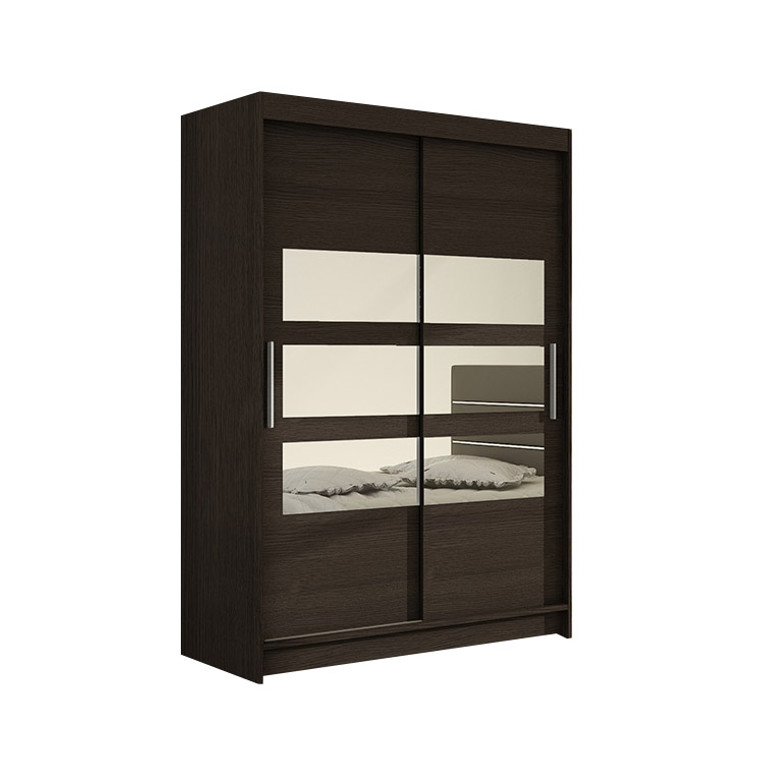 Šatní skříň s posuvnými dveřmi Miami V. Šatní skříň je extrémně odolná díky nejkvalitnějším materiálům použitým při její výrobě. Zrcadla umístěná na čelech šatní skříně jí dodávají další kouzlo a opticky zvětšují místnost. Skříň je velmi prostorná.