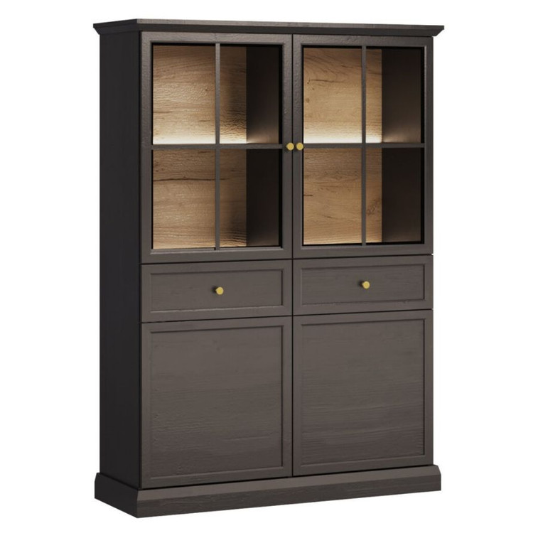 Praktická vitrína s prosklenými dveřmi a LED osvětlením. Uvnitř jsou dvě police na knihy nebo suvenýry z cest, které budou díky osvětlení skvěle vystaveny. Součástí vitríny jsou také dvě zásuvky na drobnosti a prostorné skříňky. Černohnědý nebo bílý dekor s hlubokými přírodními póry dřeva má různé stupně lesku a působí mimořádně dynamicky a velmi rozmanitě. Kolekce Lucca vám umožňuje volně míchat klasický a moderní styl.