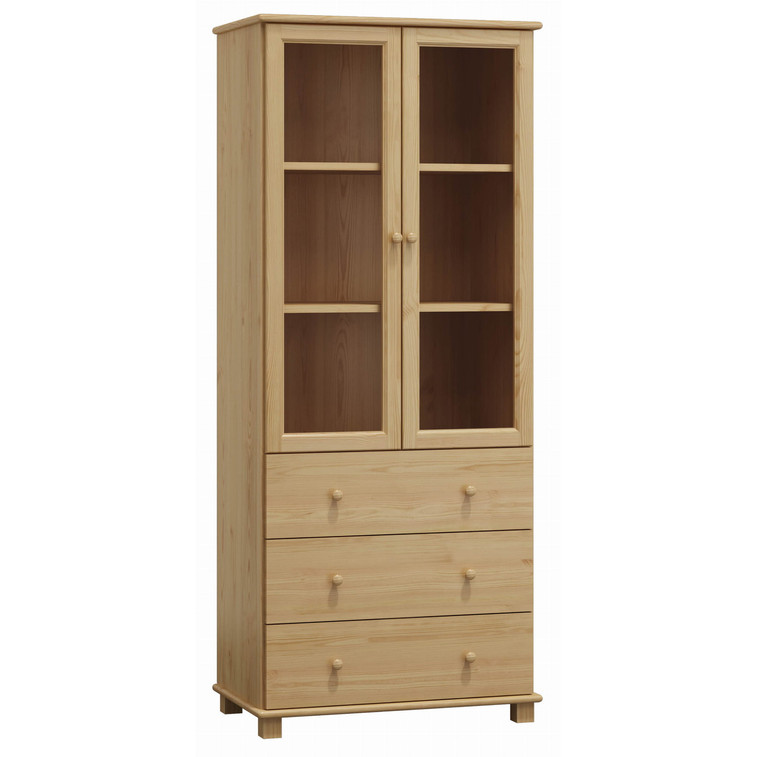 Vitrína RW104 je vyrobena z mimořádně odolného přírodního borovicového dřeva, které zaručuje odolnost a stabilitu konstrukce nábytku. Skleněná úprava dvířek umožňuje vystavit dekorativní prvky, zdůrazňující originální design. Přírodní materiál dokonale kombinuje eleganci s funkčností a vytváří tak jedinečný interiér.